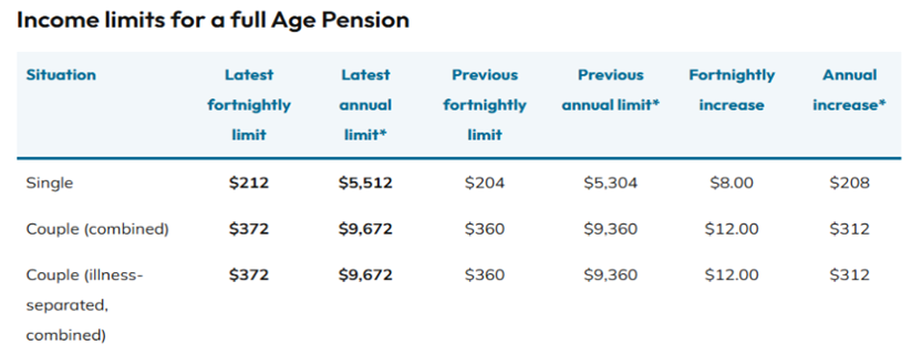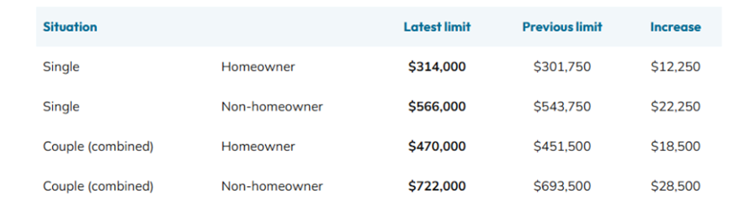 Latest limits apply from 1 July 2024 to 30 June 2025. Source: Services Australia and SuperGuide.