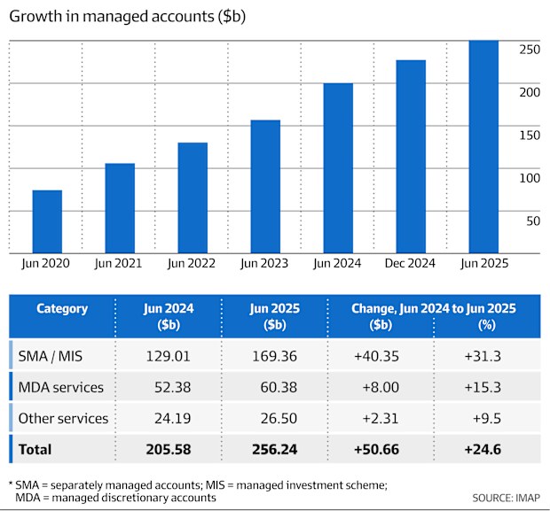 The aforementioned growth relates to Australia’s managed account sector which had swelled to $256.2 billion at June 30, more than three times the almost $80 billion balance in mid-2020, according to figures compiled by the Institute of Managed Account Professionals.