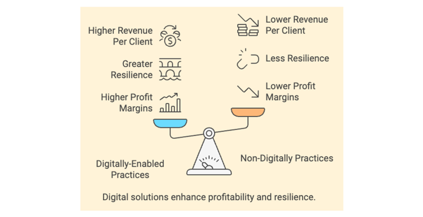 The numbers from the Landscape Report are compelling - practices using digital solutions for efficiency show average profit margins between 24-40%, while those without digital solutions average just 14-20%. These digitally-enabled practices aren't just more profitable - they're more resilient, being 2.1 times more likely to achieve profit margins above 30% and reporting 36% higher revenue per client. However, technology alone isn't the answer. The highest-performing practices are those that design their entire operation around efficiency, implementing technology within a carefully designed system rather than simply digitising existing processes.