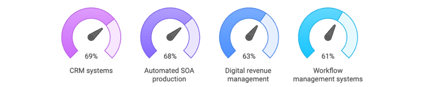 The technology stack supporting these redesigned processes is substantial. The data shows that 74% of practices now use integrated tech stacks, up from 71% last year. The most common components include: